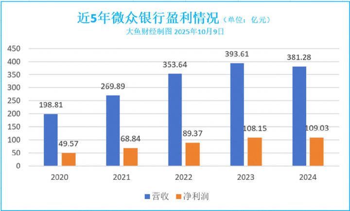 近年来,微众银行营收、净利润增长逐渐放缓,在2024年出现了营收下滑的情况。2020至2024年,该行营收增速分别为33.69%、35.76%、31.03%、11.3%、-3.13%;净利润增速分别为25.5%、38.87%、29.83%、21.02%、0.81%。